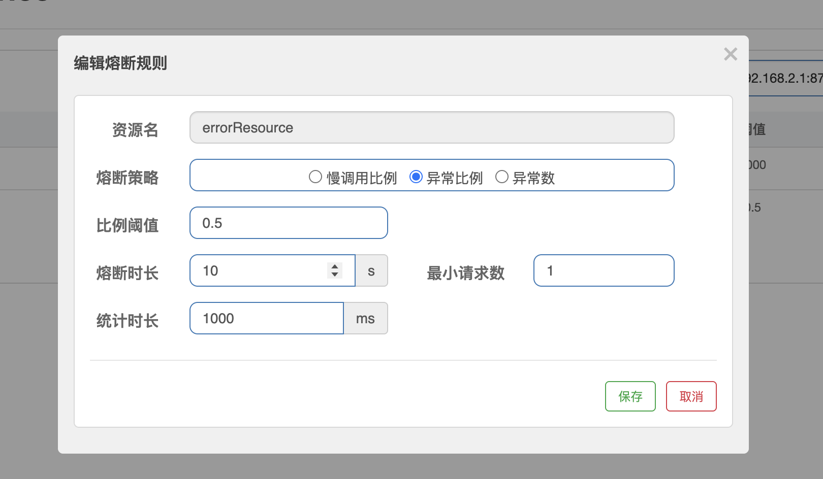在 Sentinel Dashboard 中配置,我们的请求数均设置成1,能很好的展示效果,但是这个值是为了防止低流量误熔断的,在真实场景中需要根据需求自行配置:
